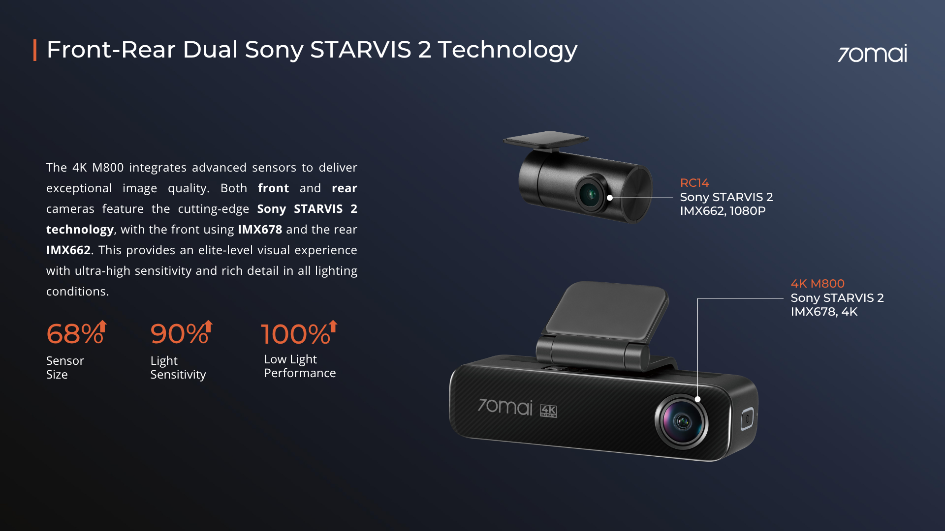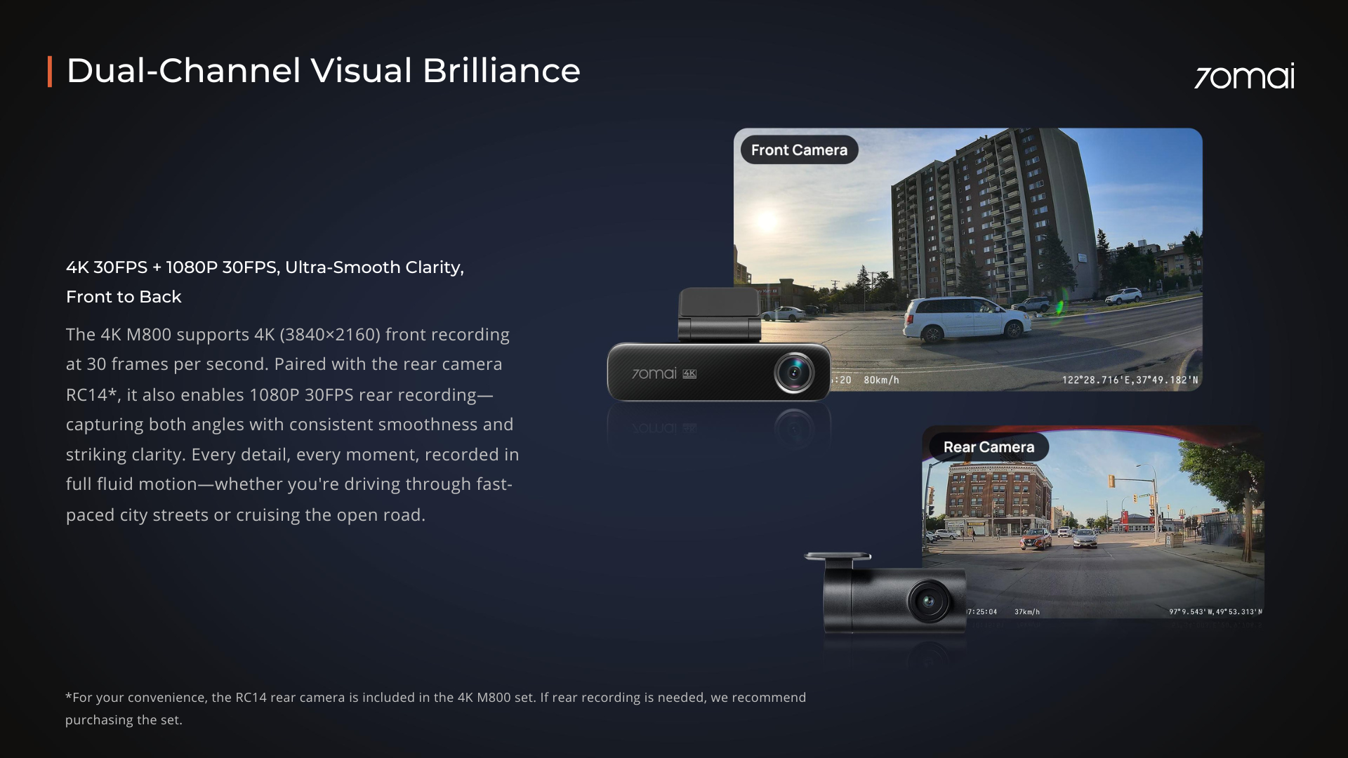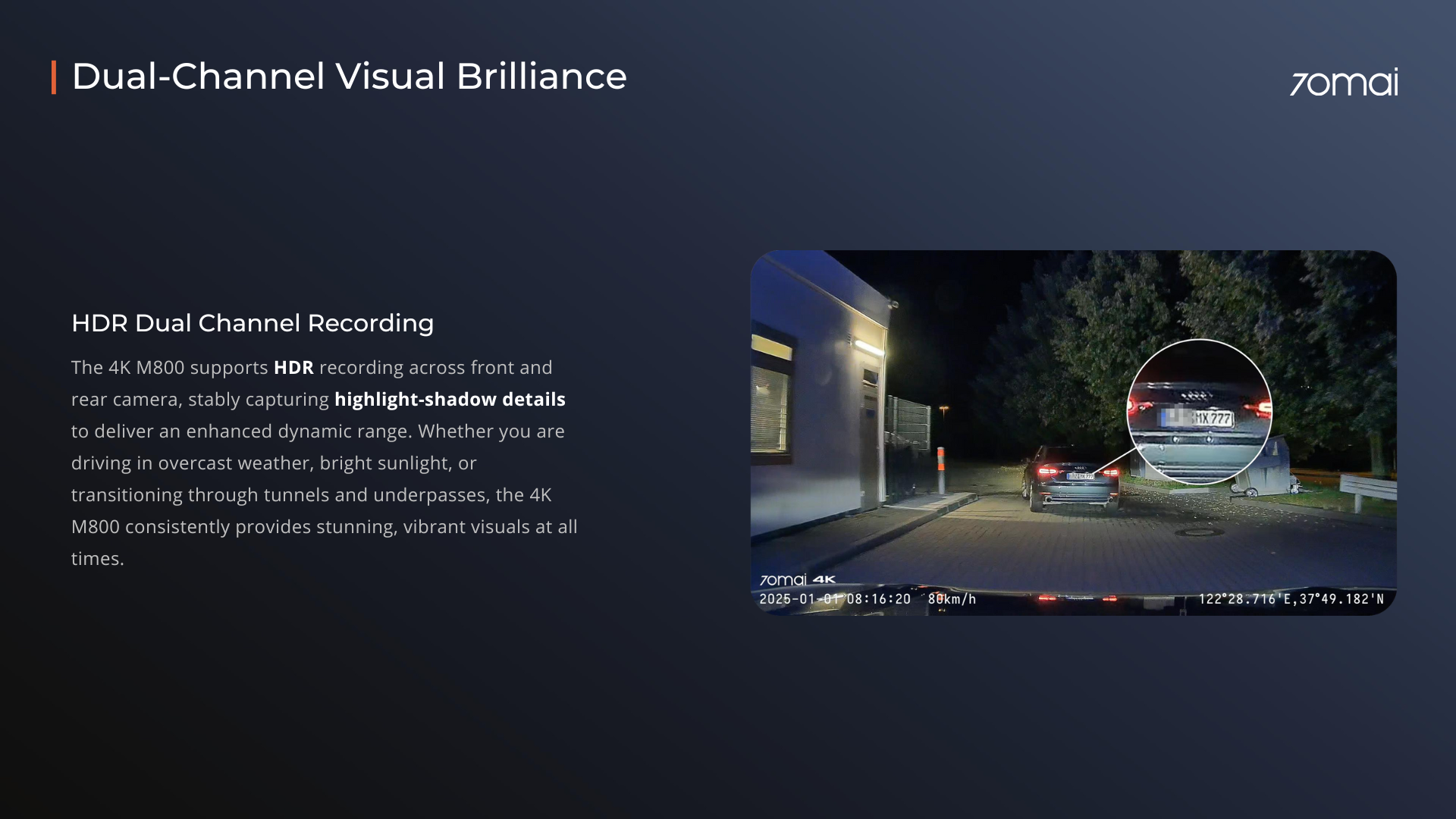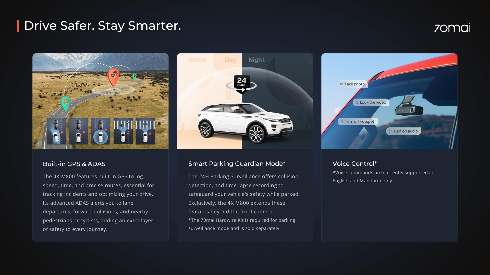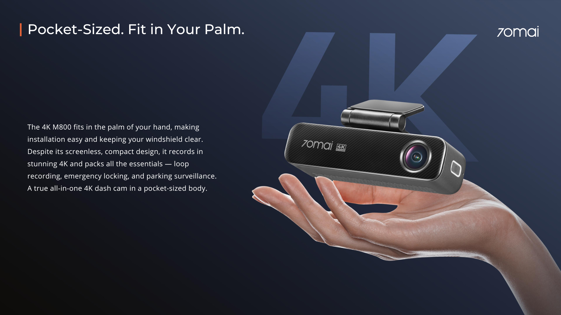 كاميرا داش كام 70mai M800 بدقة 4K HDR وذاكرة 128 جيجابايت مدمجة مع نظام تحديد المواقع العالمي (GPS) ونظام مساعدة السائق المتقدم (ADAS).