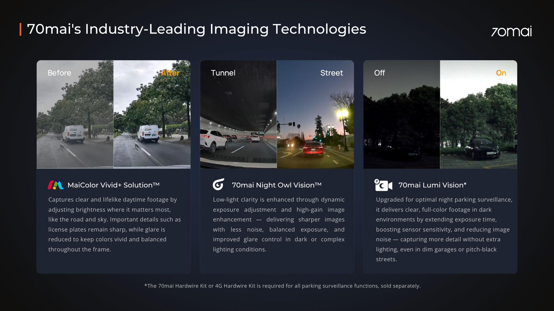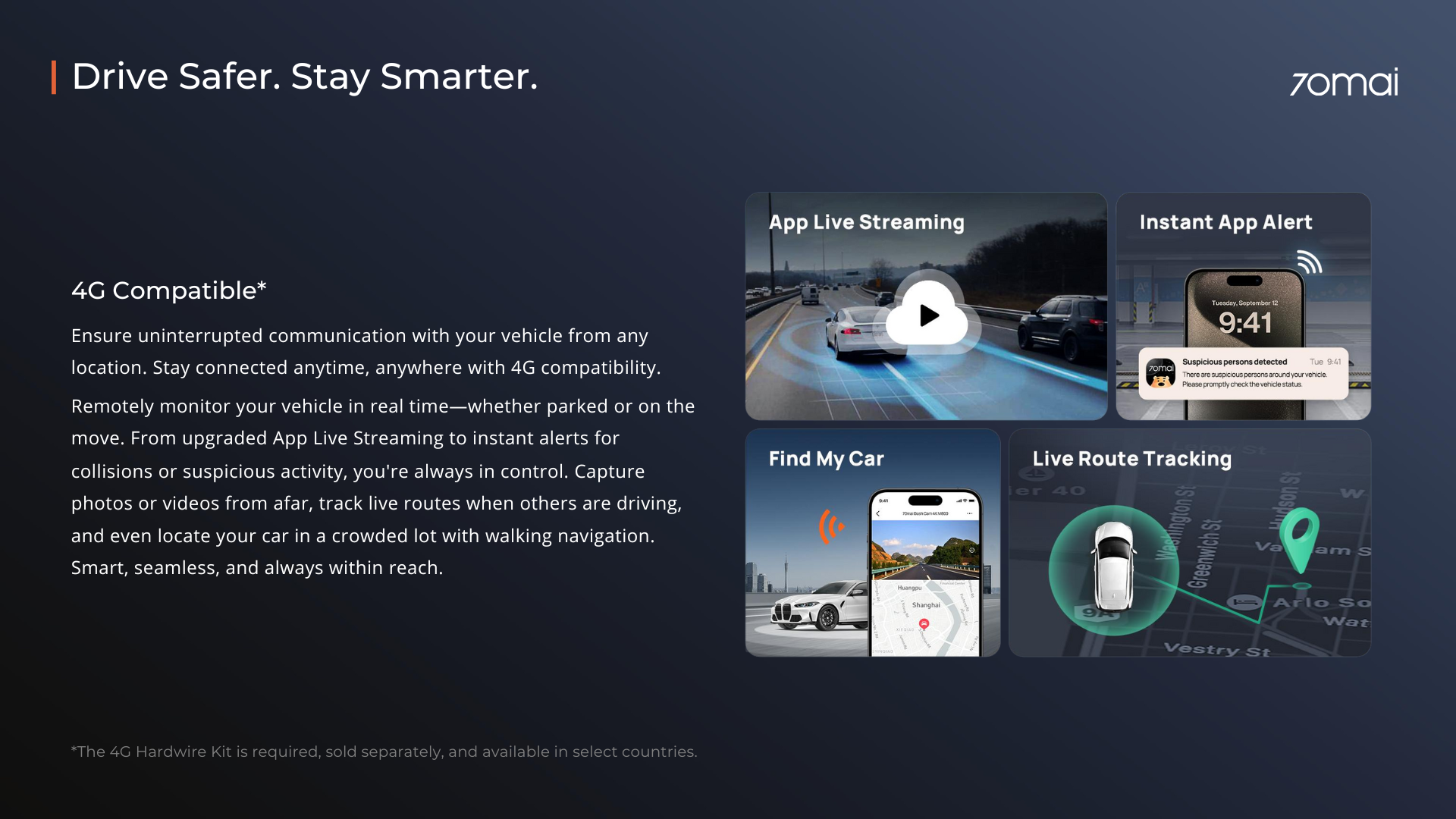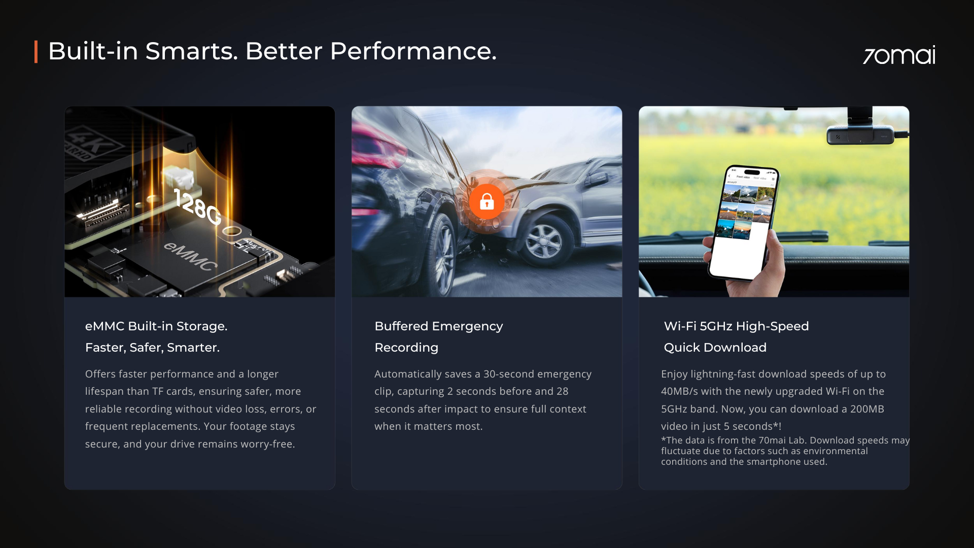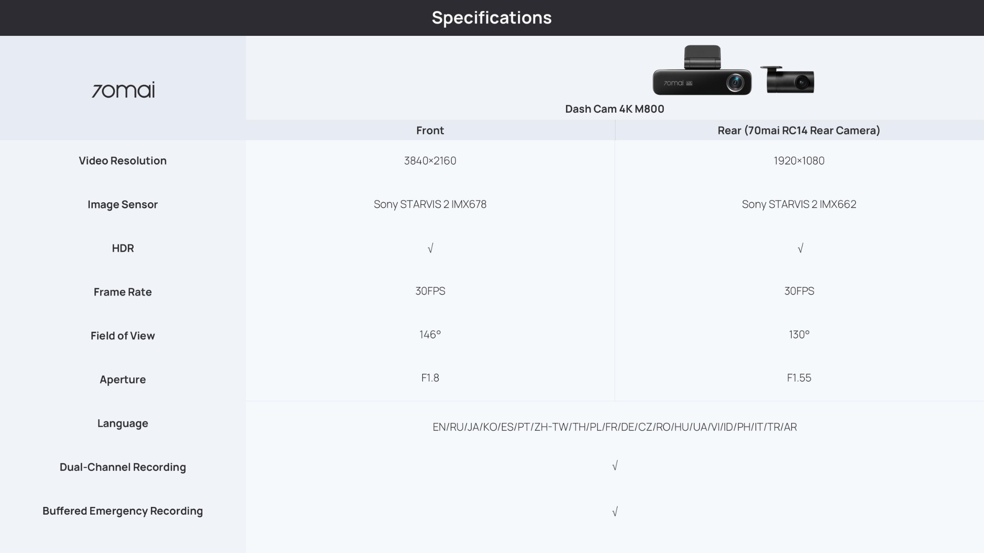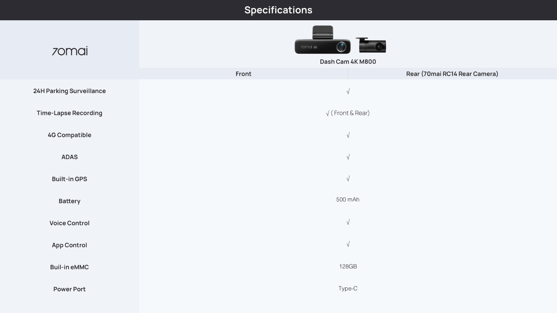 كاميرا داش كام 70mai M800 بدقة 4K HDR وذاكرة 128 جيجابايت مدمجة مع نظام تحديد المواقع العالمي (GPS) ونظام مساعدة السائق المتقدم (ADAS).